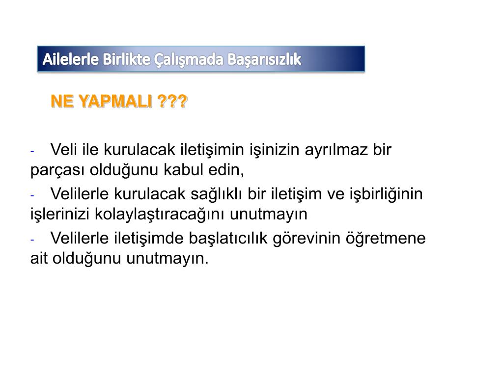 Ailelerle Birlikte Çalışmada Başarısızlık Eğitim bir ekip işidir, anne babalar bu ekibin bir parçasıdır, Onlarla yapacağınız işbirliği sınıftaki kontrolünüze de katkıda bulunacaktır, Öğrencilerde görülen başarısızlığın ve davranış bozukluklarının sebeplerinden %45’i aile içi faktörlerden kaynaklanır. Veliye ayıracağımız zaman bize kazanç olarak geri dönecektir.