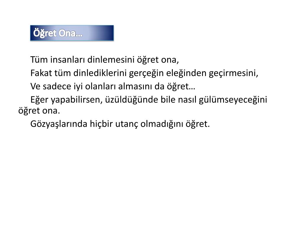 Öğret Ona… Tüm insanları dinlemesini öğret ona, Fakat tüm dinlediklerini gerçeğin eleğinden geçirmesini, Ve sadece iyi olanları almasını da öğret… Eğer yapabilirsen, üzüldüğünde bile nasıl gülümseyeceğini öğret ona. Gözyaşlarında hiçbir utanç olmadığını öğret.