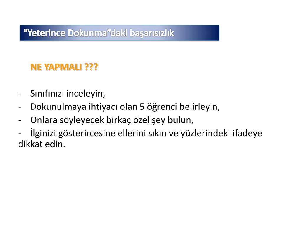 “Yeterince Dokunma”daki başarısızlık NE YAPMALI ??? • Sınıfınızı inceleyin, • Dokunulmaya ihtiyacı olan 5 öğrenci belirleyin, • Onlara söyleyecek birkaç özel şey bulun, • İlginizi gösterircesine ellerini sıkın ve yüzlerindeki ifadeye dikkat edin.