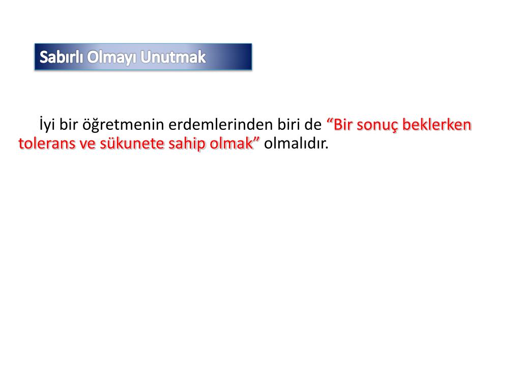 Sabırlı Olmayı Unutmak İyi bir öğretmenin erdemlerinden biri de “Bir sonuç beklerken tolerans ve sükunete sahip olmak” olmalıdır.