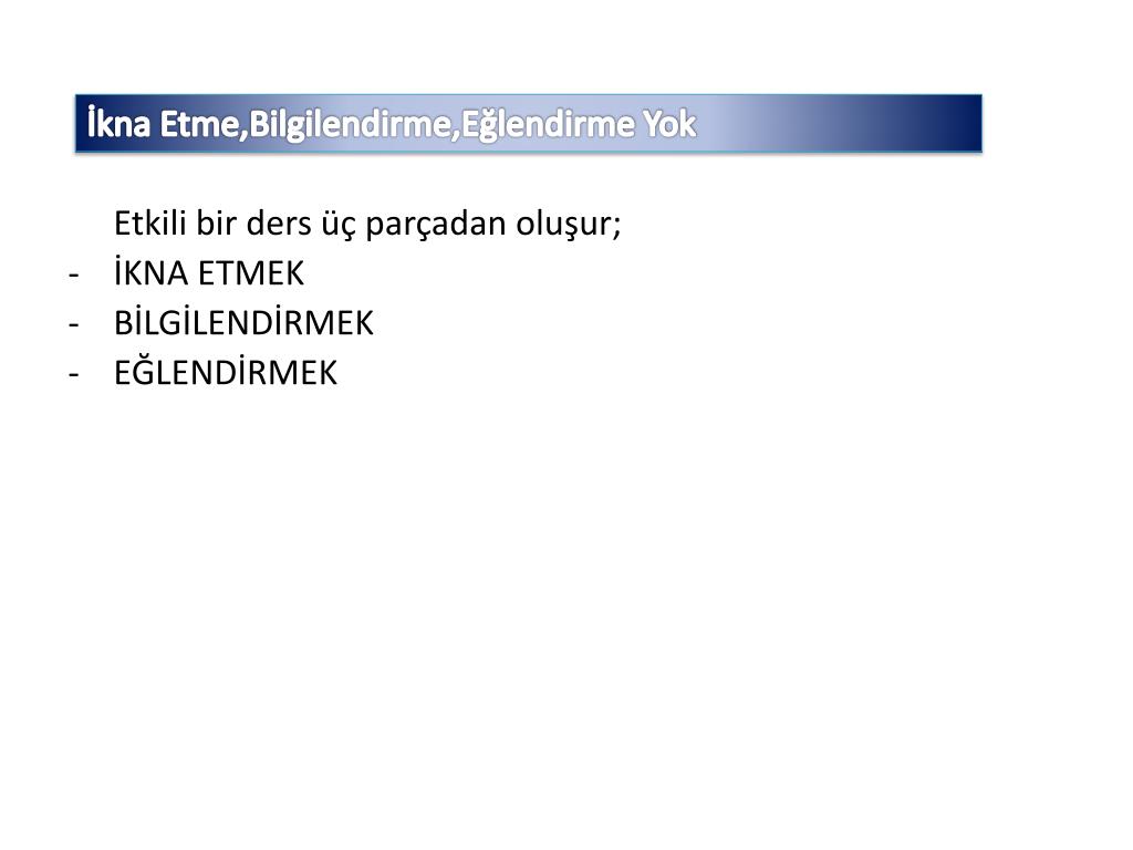 İkna Etme,Bilgilendirme,Eğlendirme Yok Etkili bir ders üç parçadan oluşur; • İKNA ETMEK • BİLGİLENDİRMEK • EĞLENDİRMEK