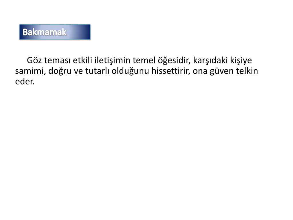 Bakmamak Göz teması etkili iletişimin temel öğesidir, karşıdaki kişiye samimi, doğru ve tutarlı olduğunu hissettirir, ona güven telkin eder.