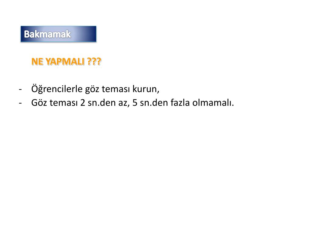 Bakmamak NE YAPMALI ??? • Öğrencilerle göz teması kurun, • Göz teması 2 sn.den az, 5 sn.den fazla olmamalı.