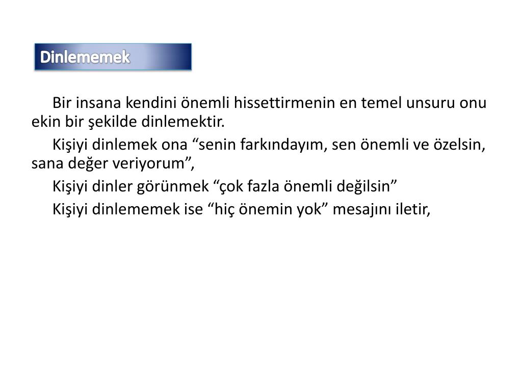 Dinlememek Bir insana kendini önemli hissettirmenin en temel unsuru onu ekin bir şekilde dinlemektir. Kişiyi dinlemek ona “senin farkındayım, sen önemli ve özelsin, sana değer veriyorum”, Kişiyi dinler görünmek “çok fazla önemli değilsin” Kişiyi dinlememek ise “hiç önemin yok” mesajını iletir,