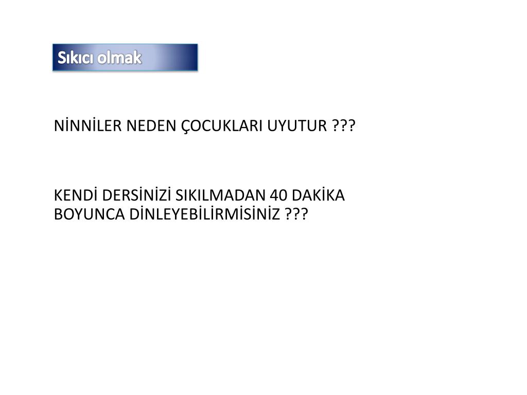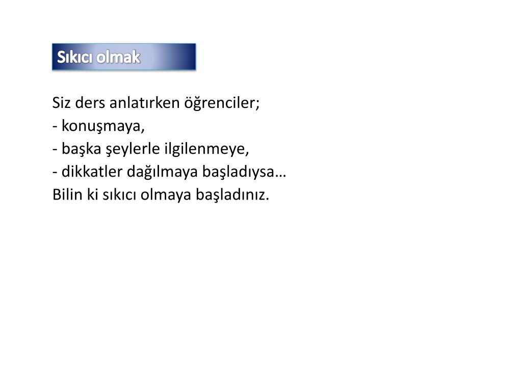 Sıkıcı olmak Siz ders anlatırken öğrenciler; - konuşmaya, - başka şeylerle ilgilenmeye, - dikkatler dağılmaya başladıysa… Bilin ki sıkıcı olmaya başladınız.