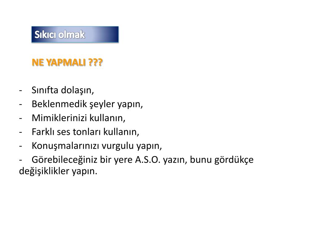 Sıkıcı olmak NE YAPMALI ??? • Sınıfta dolaşın, • Beklenmedik şeyler yapın, • Mimiklerinizi kullanın, • Farklı ses tonları kullanın, • Konuşmalarınızı vurgulu yapın, • Görebileceğiniz bir yere A.S.O. yazın, bunu gördükçe değişiklikler yapın.