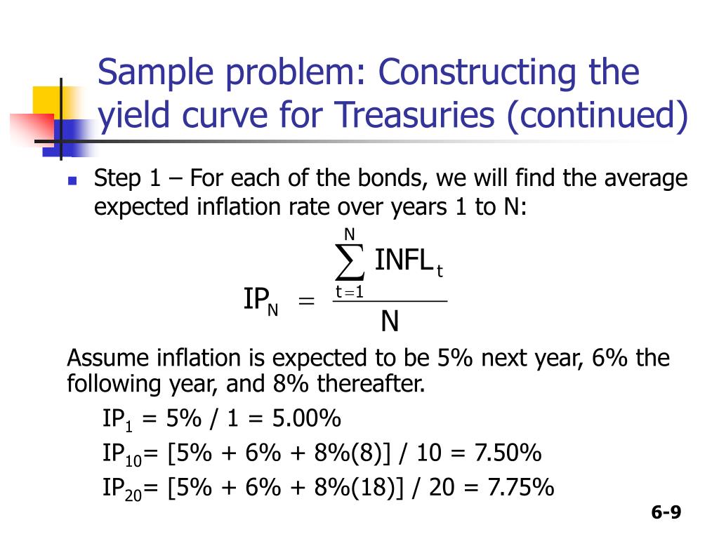 Sample problem: Constructing the yield curve for Treasuries (continued) • Step 1 – For each of the bonds, we will find the average expected inflation rate over years 1 to N: Assume inflation is expected to be 5% next year, 6% the following year, and 8% thereafter. IP1 = 5% / 1 = 5.00% IP10= [5% + 6% + 8%(8)] / 10 = 7.50% IP20= [5% + 6% + 8%(18)] / 20 = 7.75%