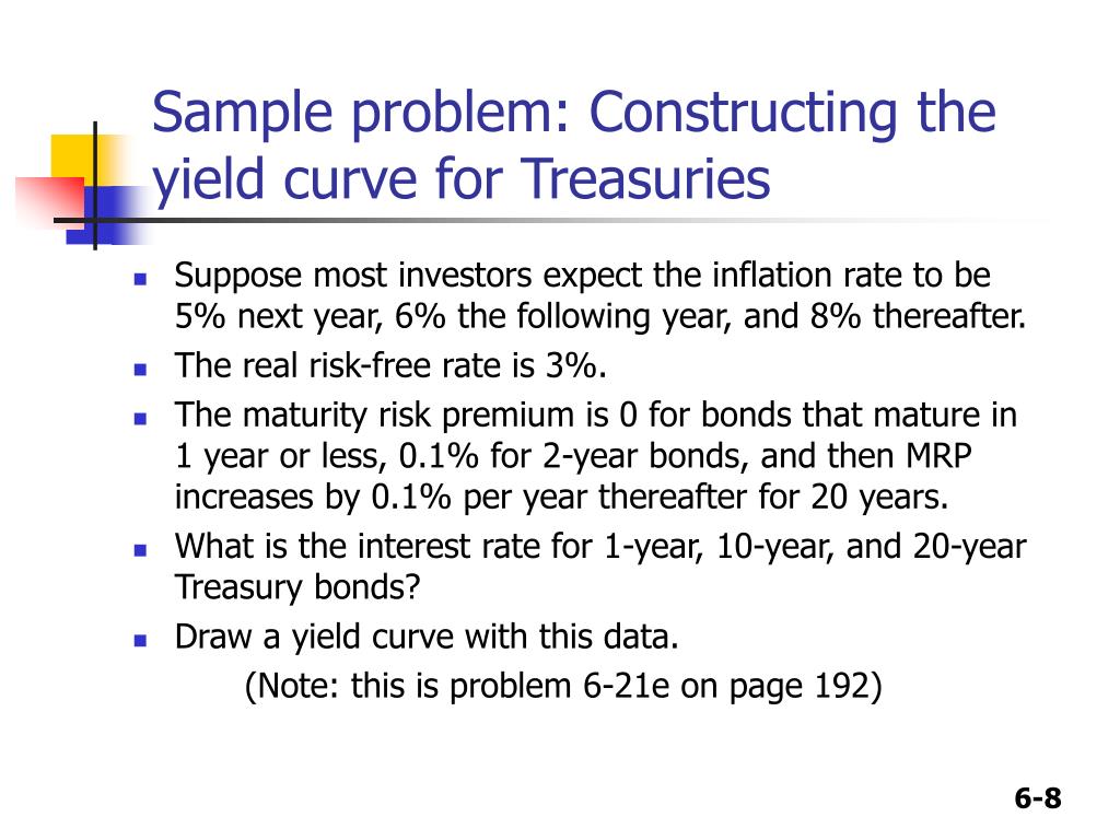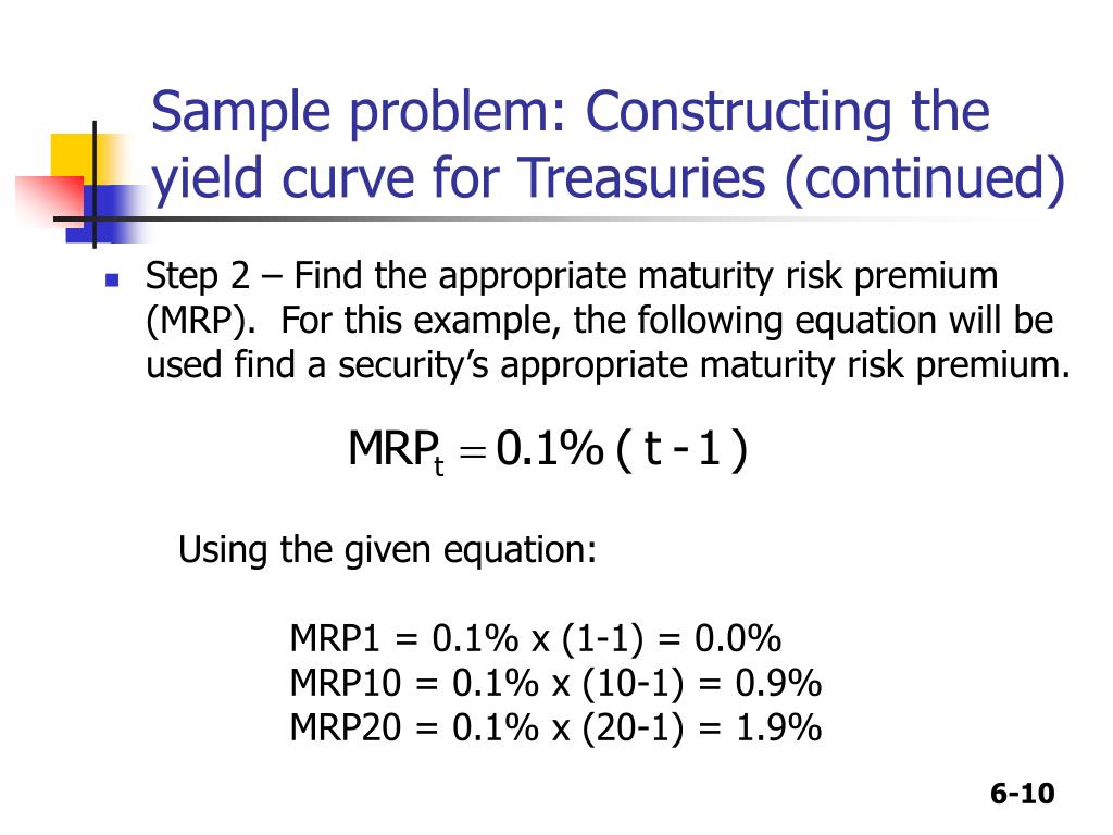 Sample problem: Constructing the yield curve for Treasuries (continued) • Step 2 – Find the appropriate maturity risk premium (MRP). For this example, the following equation will be used find a security’s appropriate maturity risk premium. Using the given equation: MRP1 = 0.1% x (1-1) = 0.0% MRP10 = 0.1% x (10-1) = 0.9% MRP20 = 0.1% x (20-1) = 1.9%