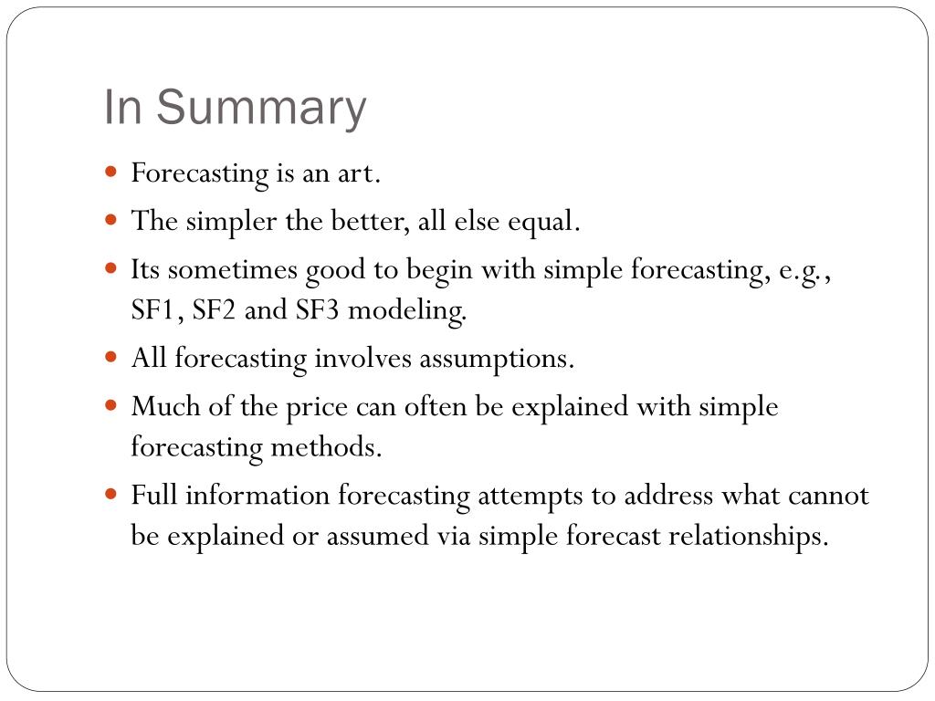 In Summary • Forecasting is an art. • The simpler the better, all else equal. • Its sometimes good to begin with simple forecasting, e.g., SF1, SF2 and SF3 modeling. • All forecasting involves assumptions. • Much of the price can often be explained with simple forecasting methods. • Full information forecasting attempts to address what cannot be explained or assumed via simple forecast relationships.