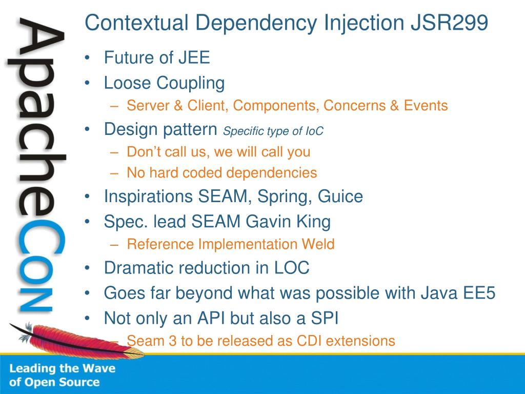 Example Generic Injection JSR330 // injection-point; no get/set needed... @Inject private BusinessService service; // Provide an implementation public class DefaultBusinessService implements BusinessService{ … } import static java.lang.annotation.ElementType.* import java.lang.annotation.*; import javax.inject.Qualifier; @Qualifier @Target( { TYPE, METHOD, FIELD }) @Retention(RUNTIME) public @interface FancyService { } // Use Qualifier to inject a more meaningful implementaion of the service: @Inject @FancyService private BusinessServicefancyService;
