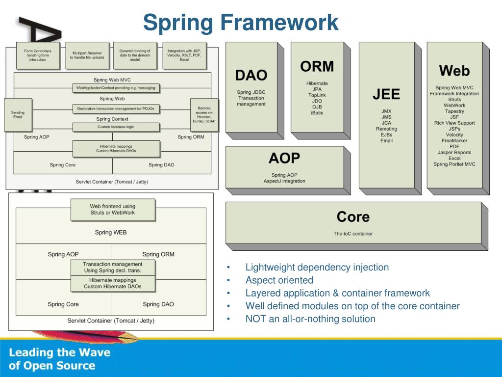 Spring Framework Lightweight dependency injection Aspect oriented Layered application & container framework Well defined modules on top of the core container NOT an all-or-nothing solution