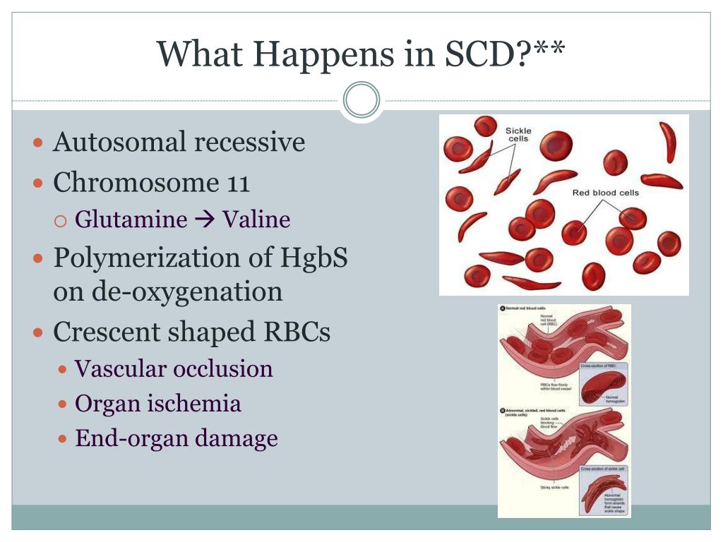 What Happens in SCD?** • Autosomal recessive • Chromosome 11 • Glutamine Valine • Polymerization of HgbS on de-oxygenation • Crescent shaped RBCs • Vascular occlusion • Organ ischemia • End-organ damage