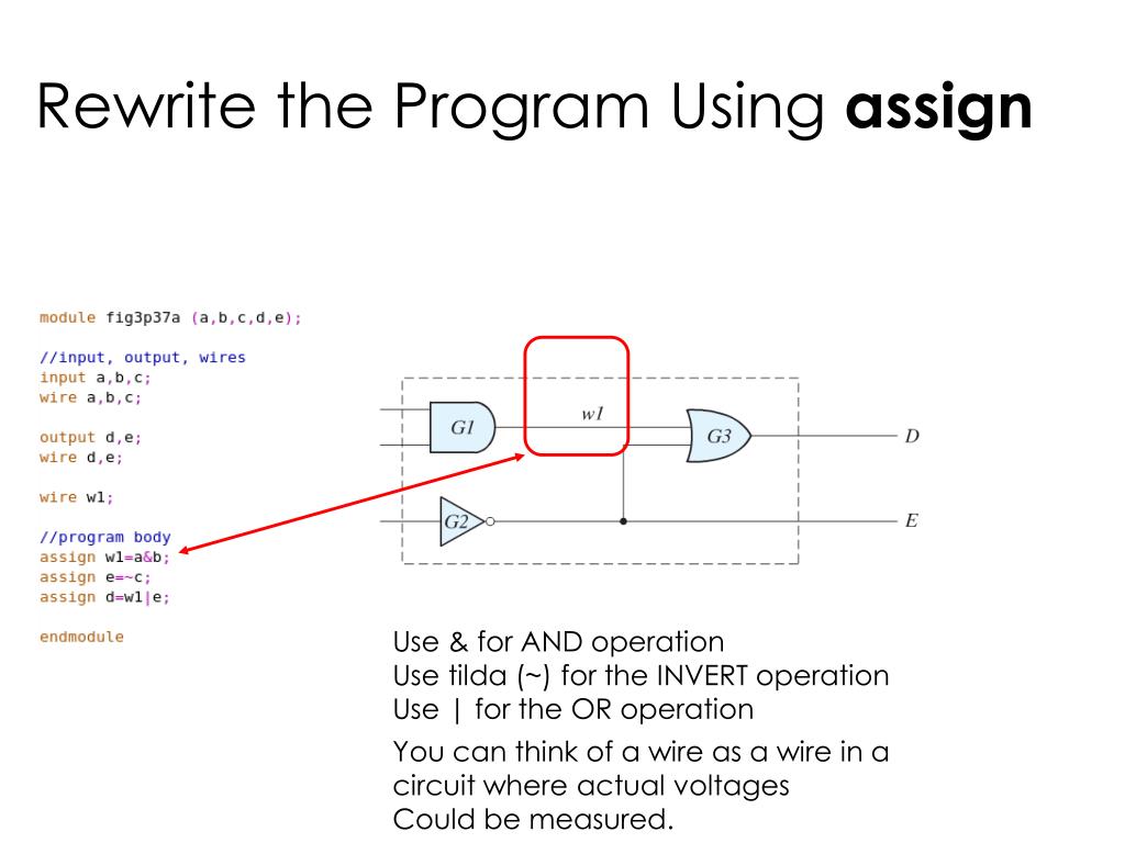 Rewrite the Program Using assign Use & for AND operation Use tilda (~) for the INVERT operation Use | for the OR operation You can think of a wire as a wire in a circuit where actual voltages Could be measured.