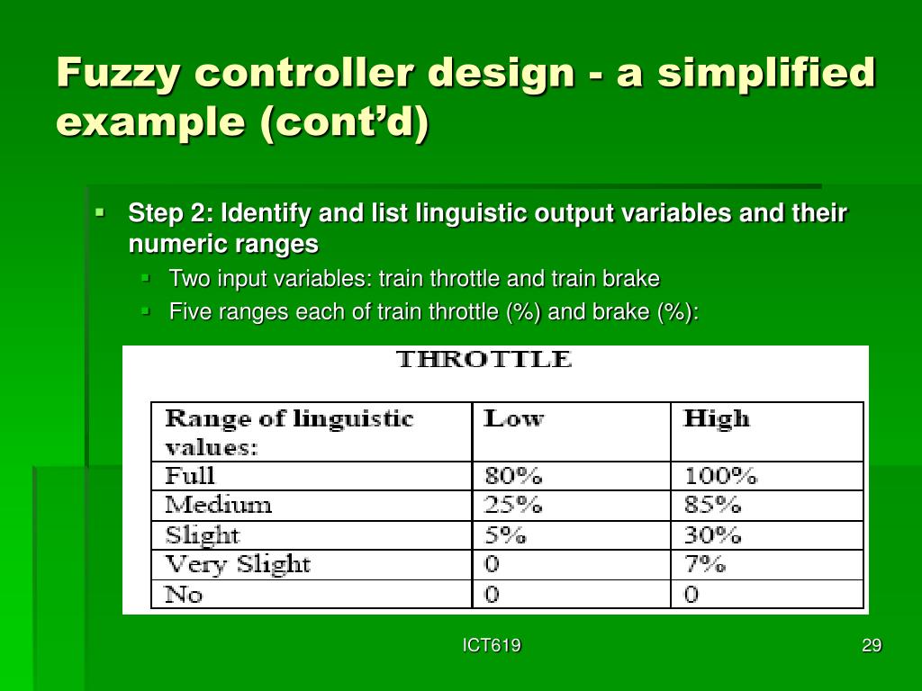Fuzzy controller design - a simplified example (cont’d) • Step 2: Identify and list linguistic output variables and their numeric ranges • Two input variables: train throttle and train brake • Five ranges each of train throttle (%) and brake (%): ICT619