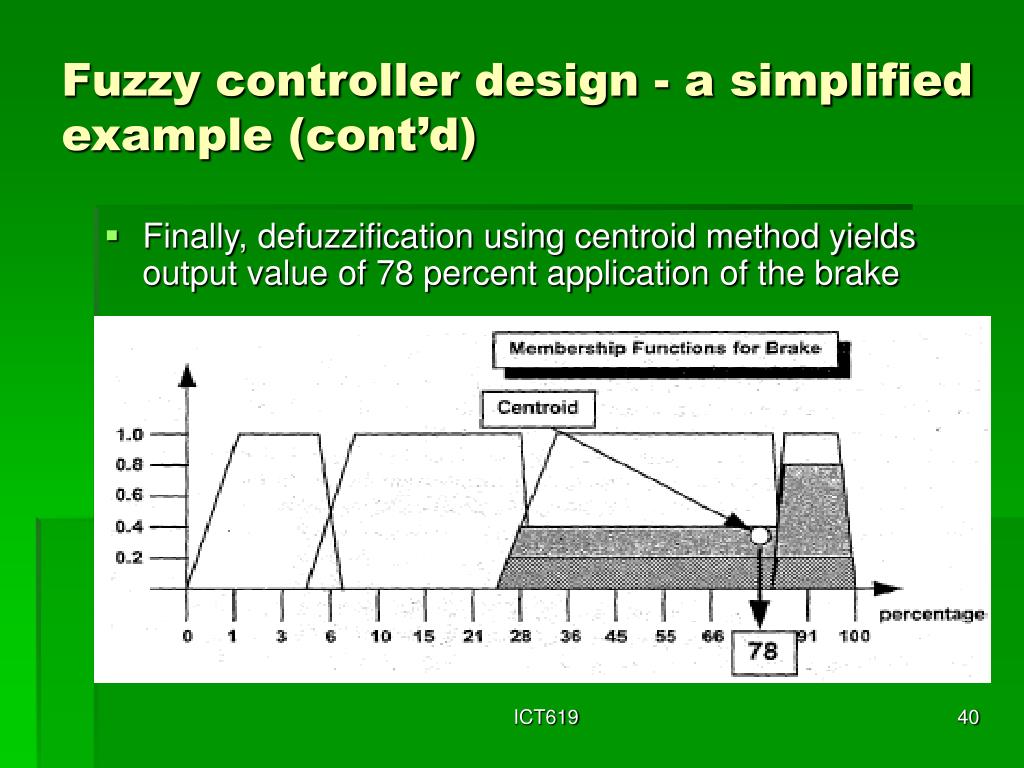 Fuzzy controller design - a simplified example (cont’d) • Finally, defuzzification using centroid method yields output value of 78 percent application of the brake ICT619