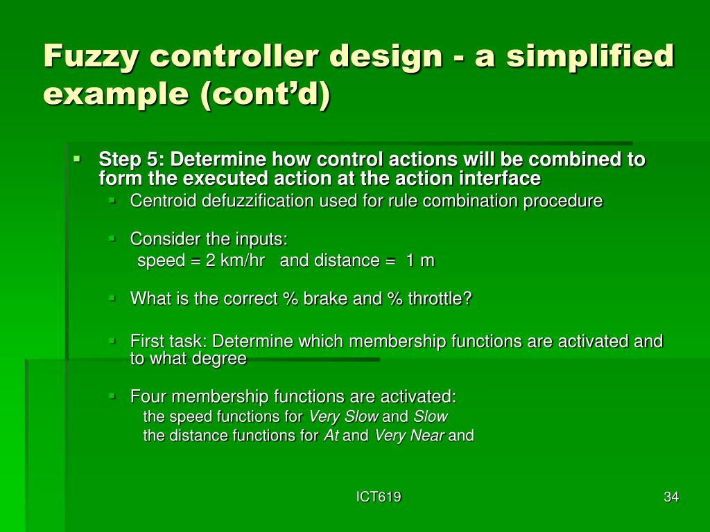 Fuzzy controller design - a simplified example (cont’d) • Step 5: Determine how control actions will be combined to form the executed action at the action interface • Centroid defuzzification used for rule combination procedure • Consider the inputs: speed = 2 km/hr and distance = 1 m • What is the correct % brake and % throttle? • First task: Determine which membership functions are activated and to what degree • Four membership functions are activated: the speed functions for Very Slow and Slow the distance functions for At and Very Near and ICT619
