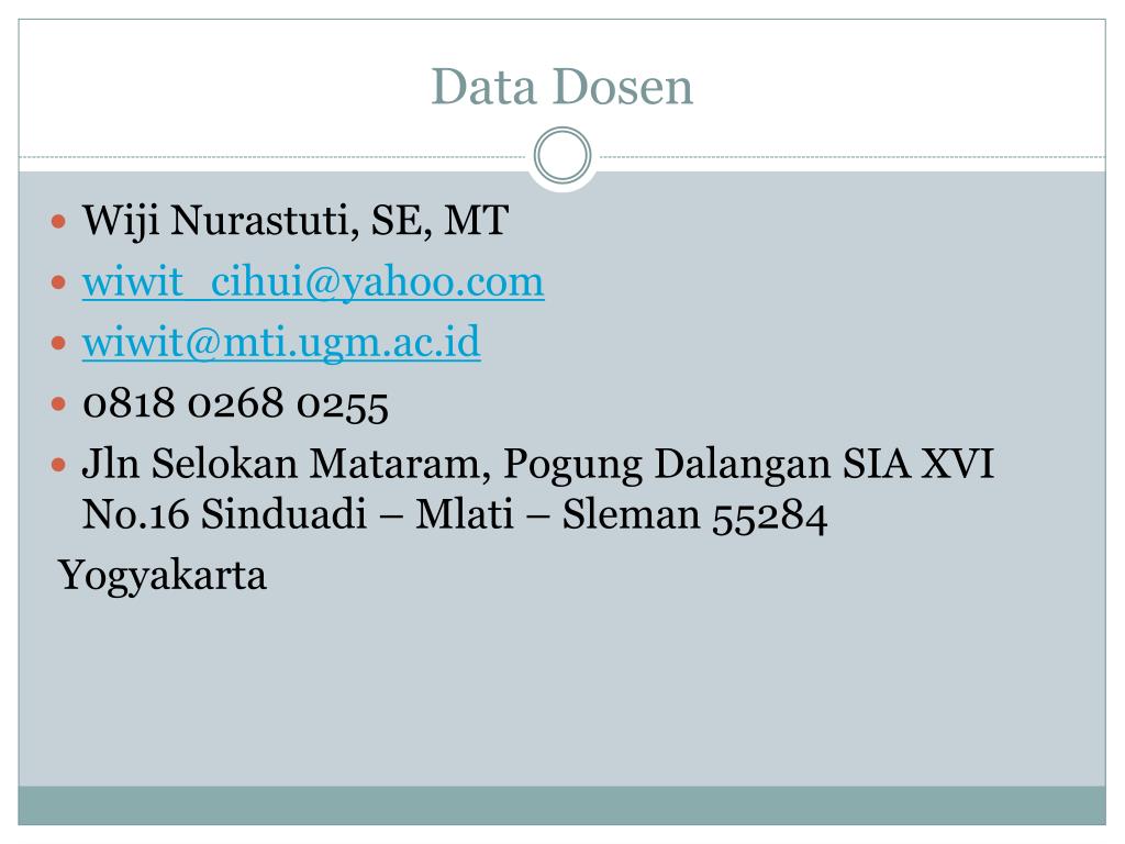 Data Dosen WijiNurastuti, SE, MT wiwit_cihui@yahoo.com wiwit@mti.ugm.ac.id 0818 0268 0255 JlnSelokanMataram, PogungDalangan SIA XVI No.16 Sinduadi – Mlati – Sleman 55284 Yogyakarta
