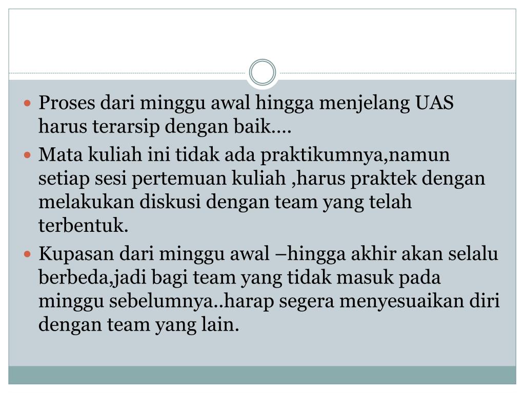 Prosesdarimingguawalhinggamenjelang UAS harusterarsipdenganbaik…. Mata kuliahinitidakadapraktikumnya,namunsetiapsesipertemuankuliah ,haruspraktekdenganmelakukandiskusidengan team yang telahterbentuk. Kupasandarimingguawal –hinggaakhirakanselaluberbeda,jadibagi team yang tidakmasukpadaminggusebelumnya..harapsegeramenyesuaikandiridengan team yang lain.