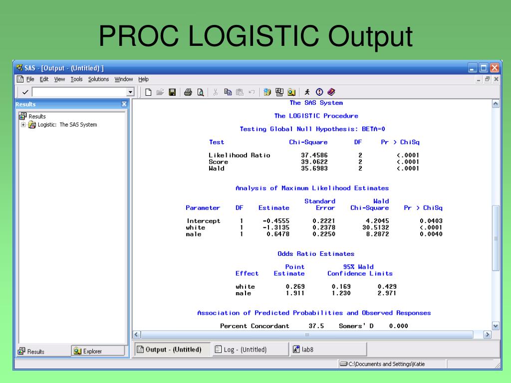 Interpreting Output Notice that the race and gender terms are both statistically significant (p < 0.0001 and p = 0.0040, respectively). The logistic regression model is:log(odds) = β0+β1(white) +β2(male) log(odds) = -0.4555 – 1.3135(white) + 0.6478(male) The odds of having intercourse is 73.1% (1-0.269) lower for whites than blacks. The odds of having intercourse is 1.911 times greater for males versus females.