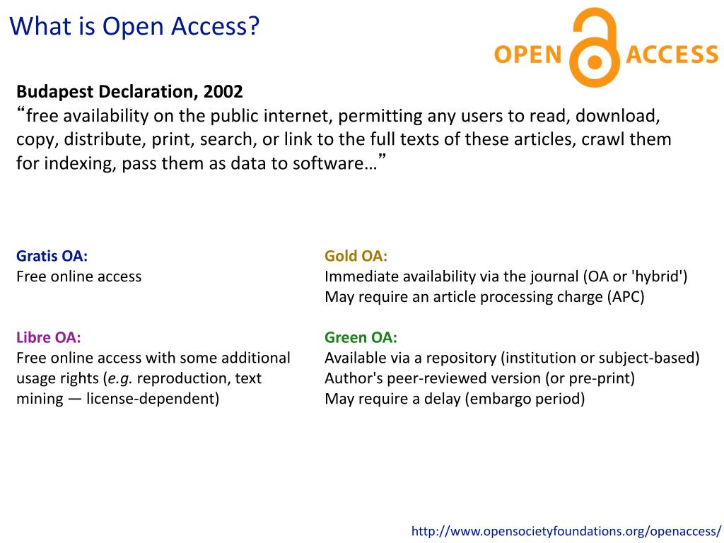 Budapest Declaration, 2002 “free availability on the public internet, permitting any users to read, download, copy, distribute, print, search, or link to the full texts of these articles, crawl them for indexing, pass them as data to software…” What is Open Access? Gratis OA: Free online access Libre OA: Free online access with some additional usage rights (e.g. reproduction, text mining — license-dependent) Gold OA: Immediate availability via the journal (OA or 'hybrid') May require an article processing charge (APC) Green OA: Available via a repository (institution or subject-based) Author's peer-reviewed version (or pre-print) May require a delay (embargo period) http://www.opensocietyfoundations.org/openaccess/