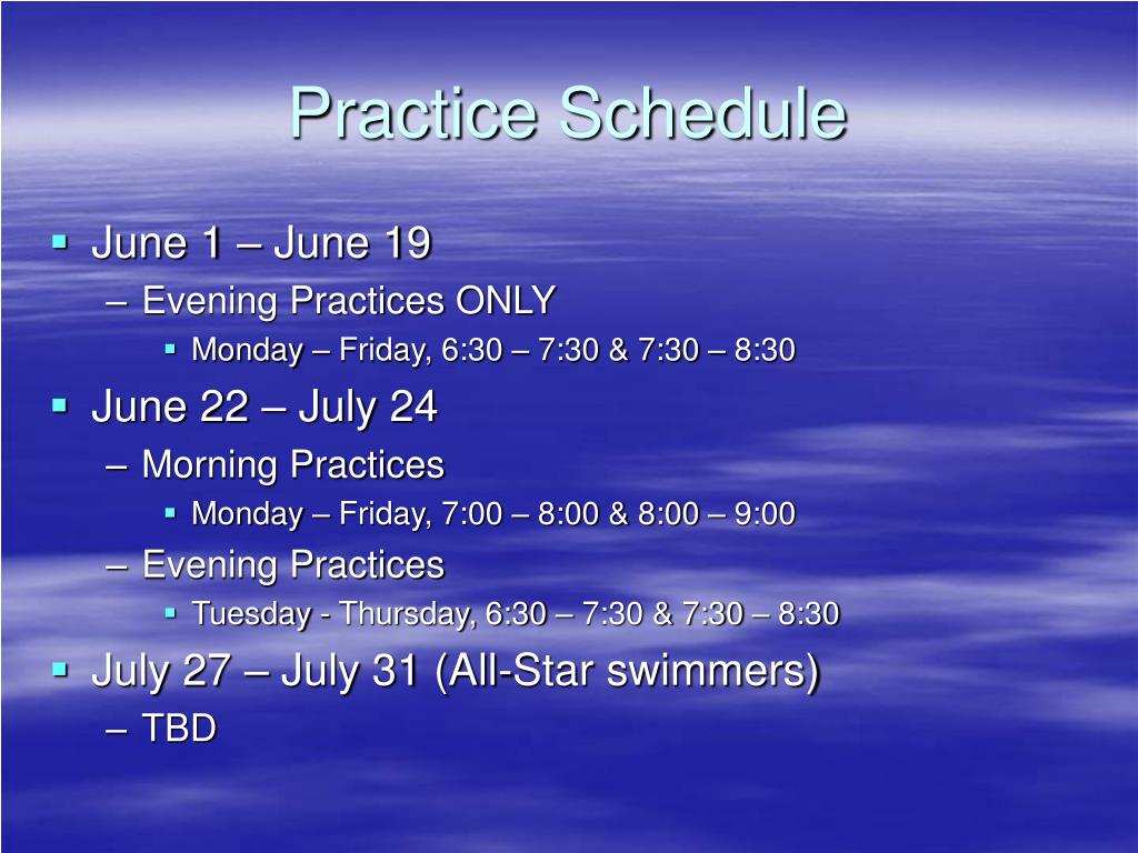 Practice Schedule • June 1 – June 19 • Evening Practices ONLY • Monday – Friday, 6:30 – 7:30 & 7:30 – 8:30 • June 22 – July 24 • Morning Practices • Monday – Friday, 7:00 – 8:00 & 8:00 – 9:00 • Evening Practices • Tuesday - Thursday, 6:30 – 7:30 & 7:30 – 8:30 • July 27 – July 31 (All-Star swimmers) • TBD