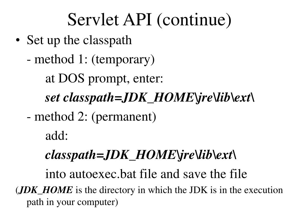 Servlet API (continue) • Set up the classpath - method 1: (temporary) at DOS prompt, enter: set classpath=JDK_HOME\jre\lib\ext\ - method 2: (permanent) add: classpath=JDK_HOME\jre\lib\ext\ into autoexec.bat file and save the file (JDK_HOME is the directory in which the JDK is in the execution path in your computer)