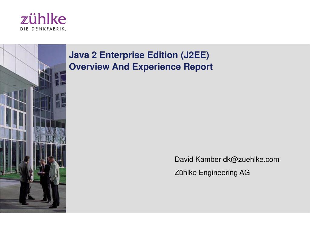 Java 2 Enterprise Edition (J2EE)Overview And Experience Report David Kamber dk@zuehlke.com Zühlke Engineering AG