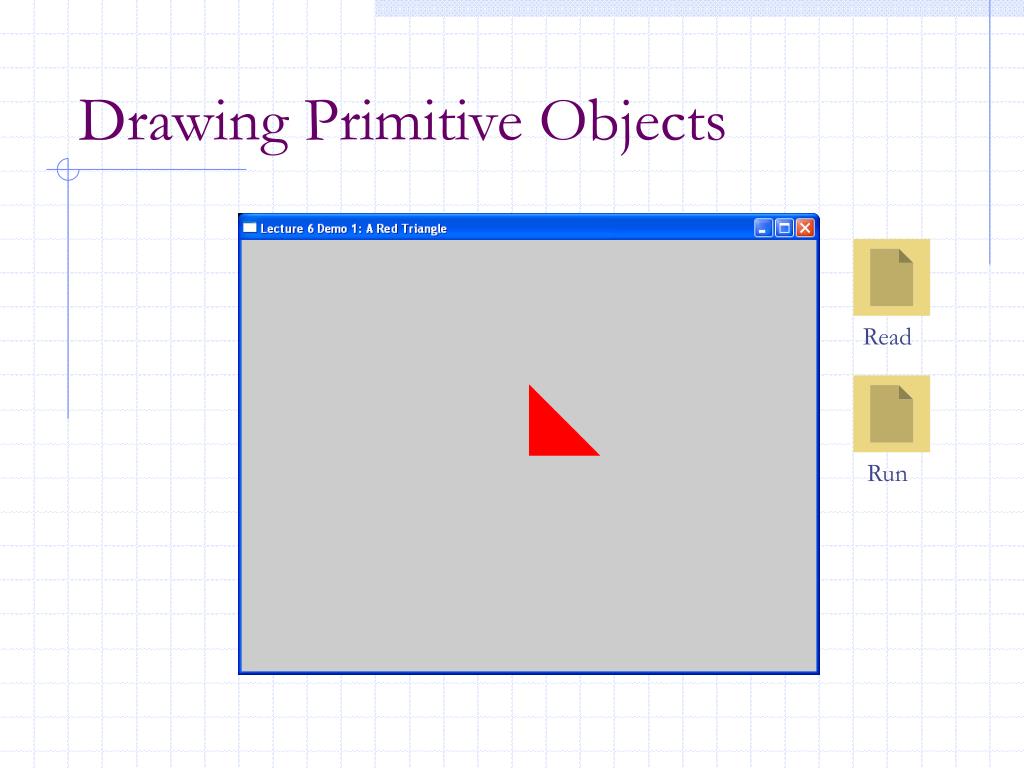 Drawing Primitive Objects • Draw a red triangle. glColor3f(1.0, 0.0, 0.0); glBegin(GL_TRIANGLES); glVertex3f(0.0, 0.0, 0.0); glVertex3f(1.0, 0.0, 0.0); glVertex3f(0.0, 1.0, 0.0); glEnd();