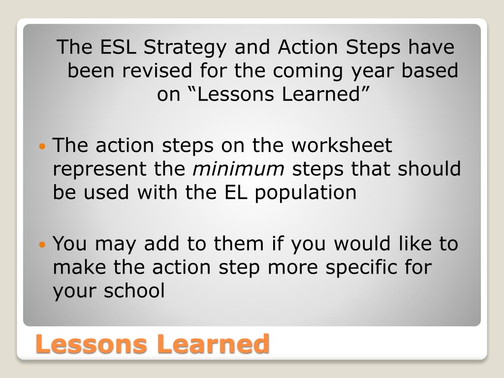 The ESL Strategy and Action Steps have been revised for the coming year based on “Lessons Learned” • The action steps on the worksheet represent the minimum steps that should be used with the EL population • You may add to them if you would like to make the action step more specific for your school Lessons Learned