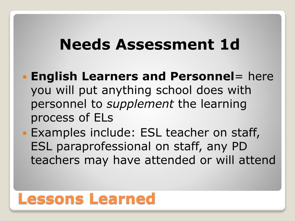 Needs Assessment 1d • English Learners and Personnel= here you will put anything school does with personnel to supplement the learning process of ELs • Examples include: ESL teacher on staff, ESL paraprofessional on staff, any PD teachers may have attended or will attend Lessons Learned
