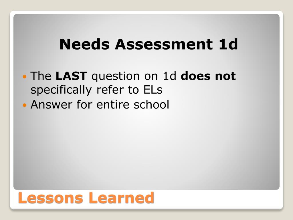 Needs Assessment 1d • The LAST question on 1d does not specifically refer to ELs • Answer for entire school Lessons Learned