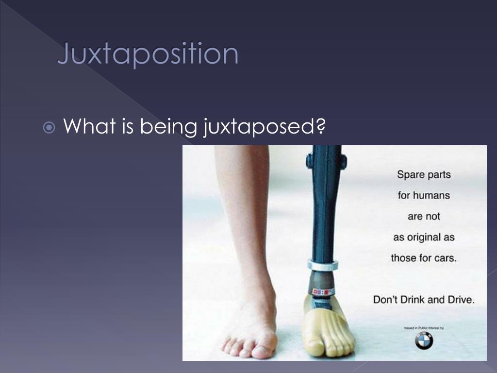 Juxtaposition • The prosthetic foot is being juxtaposed with the normal one to emphasize it even further. It pushes the viewer to put themselves into the situation and it evokes a stronger feeling. • What is being juxtaposed?