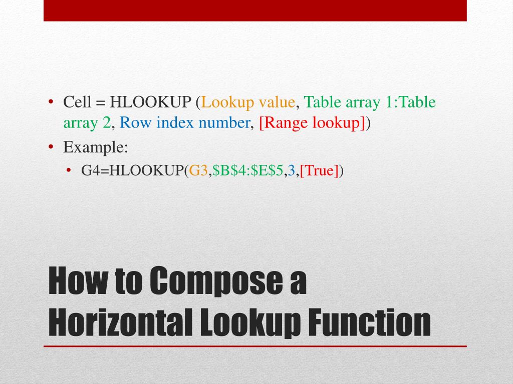 Cell = HLOOKUP (Lookup value, Table array 1:Table array 2, Row index number, [Range lookup]) • Example: • G4=HLOOKUP(G3,$B$4:$E$5,3,[True]) How to Compose a Horizontal Lookup Function