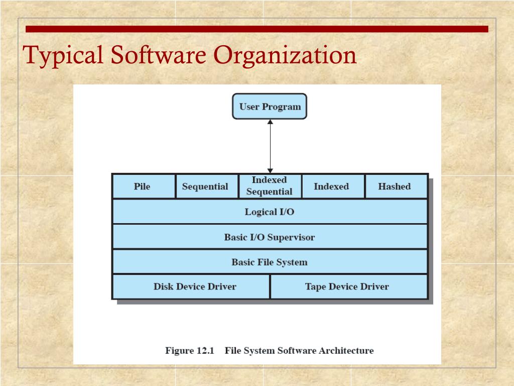 Basic File System Also referred to as the physical I/O level Primary interface with the environment outside the computer system Deals with blocks of data that are exchanged with disk or tape systems Concerned with the placement of blocks on the secondary storage device Concerned with buffering blocks in main memory Considered part of the operating system
