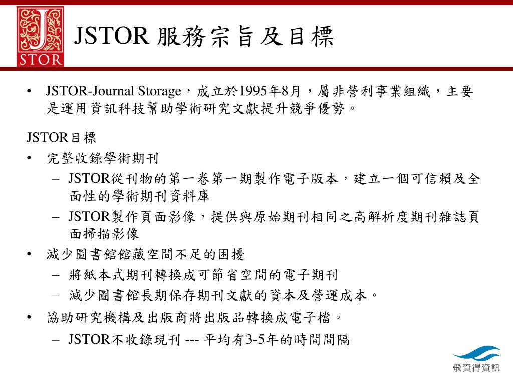 JSTOR 服務宗旨及目標 • JSTOR-Journal Storage,成立於1995年8月,屬非營利事業組織,主要是運用資訊科技幫助學術研究文獻提升競爭優勢。 JSTOR目標 • 完整收錄學術期刊 • JSTOR從刊物的第一卷第一期製作電子版本,建立一個可信賴及全面性的學術期刊資料庫 • JSTOR製作頁面影像,提供與原始期刊相同之高解析度期刊雜誌頁面掃描影像 • 減少圖書館館藏空間不足的困擾 • 將紙本式期刊轉換成可節省空間的電子期刊 • 減少圖書館長期保存期刊文獻的資本及營運成本。 • 協助研究機構及出版商將出版品轉換成電子檔。 • JSTOR不收錄現刊 --- 平均有3-5年的時間間隔
