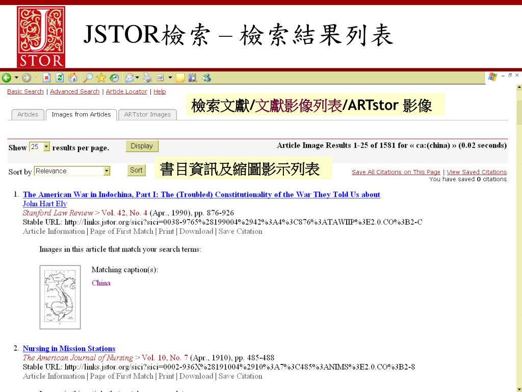 JSTOR檢索 – 檢索結果列表 檢索文獻/文獻影像列表/ARTstor 影像 書目資訊及縮圖影示列表