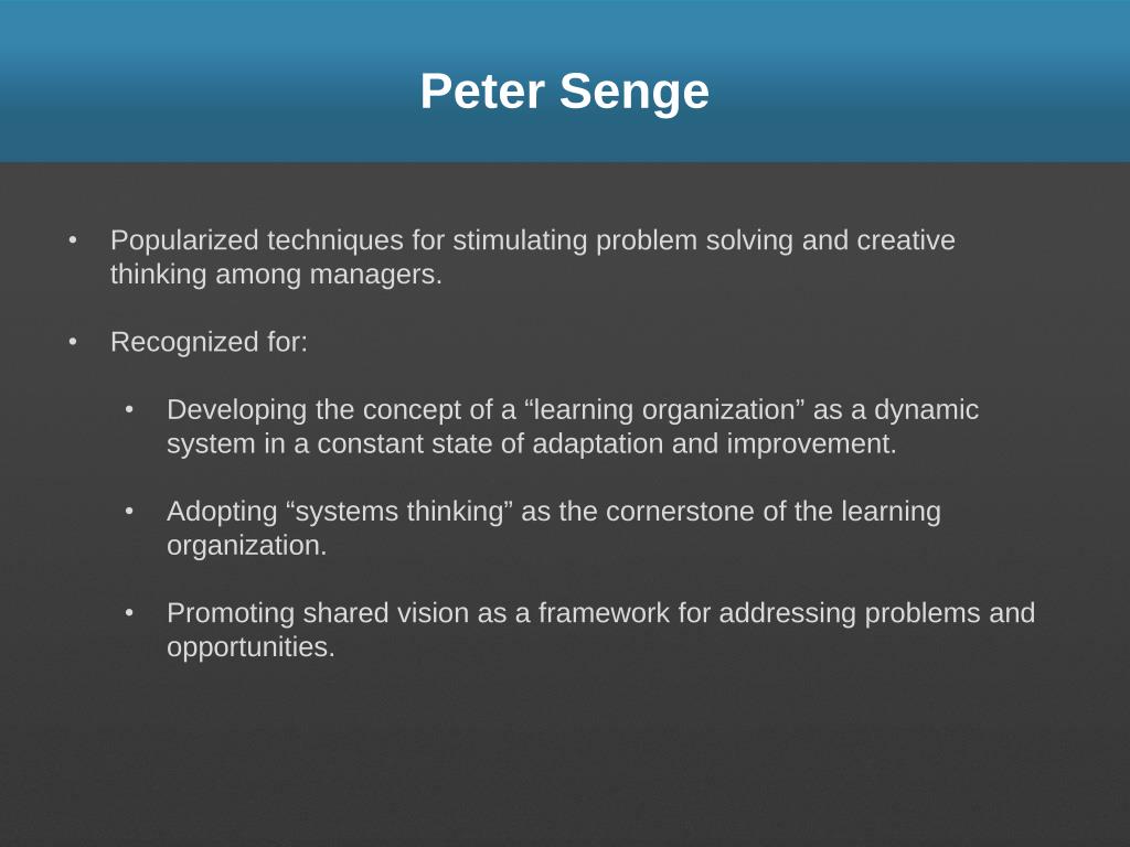 Peter Senge • Popularized techniques for stimulating problem solving and creative thinking among managers. • Recognized for: • Developing the concept of a “learning organization” as a dynamic system in a constant state of adaptation and improvement. • Adopting “systems thinking” as the cornerstone of the learning organization. • Promoting shared vision as a framework for addressing problems and opportunities.