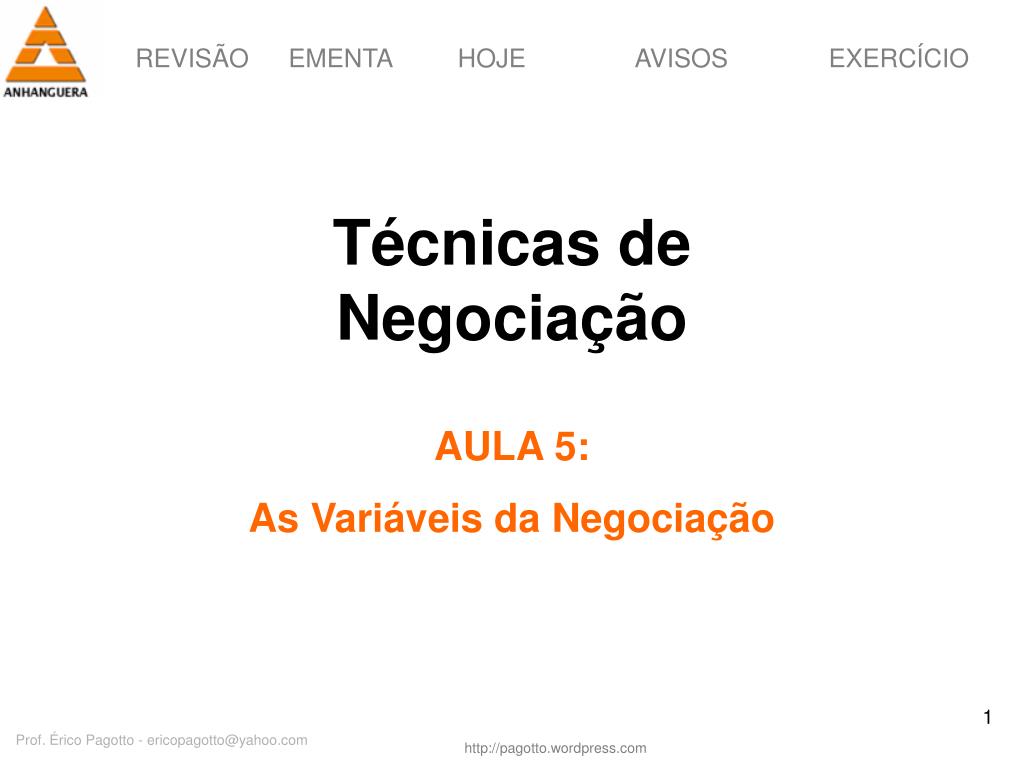 Técnicas de Negociação. AULA 5: As Variáveis da Negociação. AULA 2: Uma reflexão sobre a abordagem sistêmica na negociação. AULA 3: O processo de negociação. AULA 4: O processo de comunicação e a negociação. AULA 5: As variáveis básicas da negociação