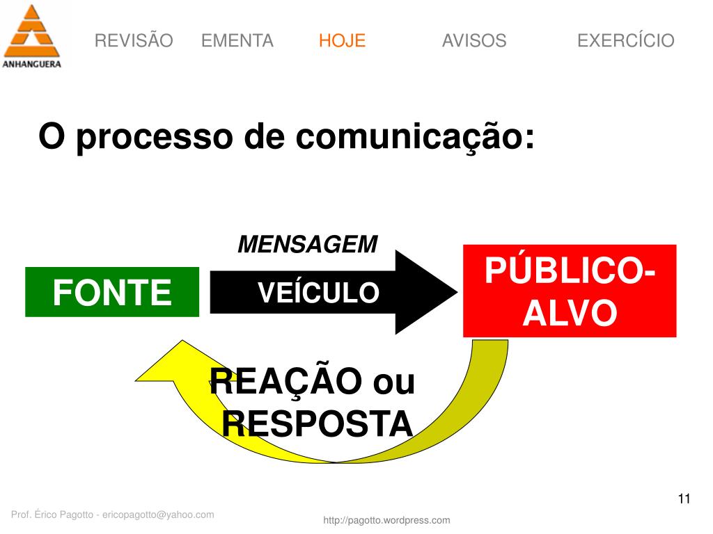 HOJE O processo de comunicação: MENSAGEM PÚBLICO-ALVO VEÍCULO FONTE REAÇÃO ou RESPOSTA Prof. Érico Pagotto - ericopagotto@yahoo.com