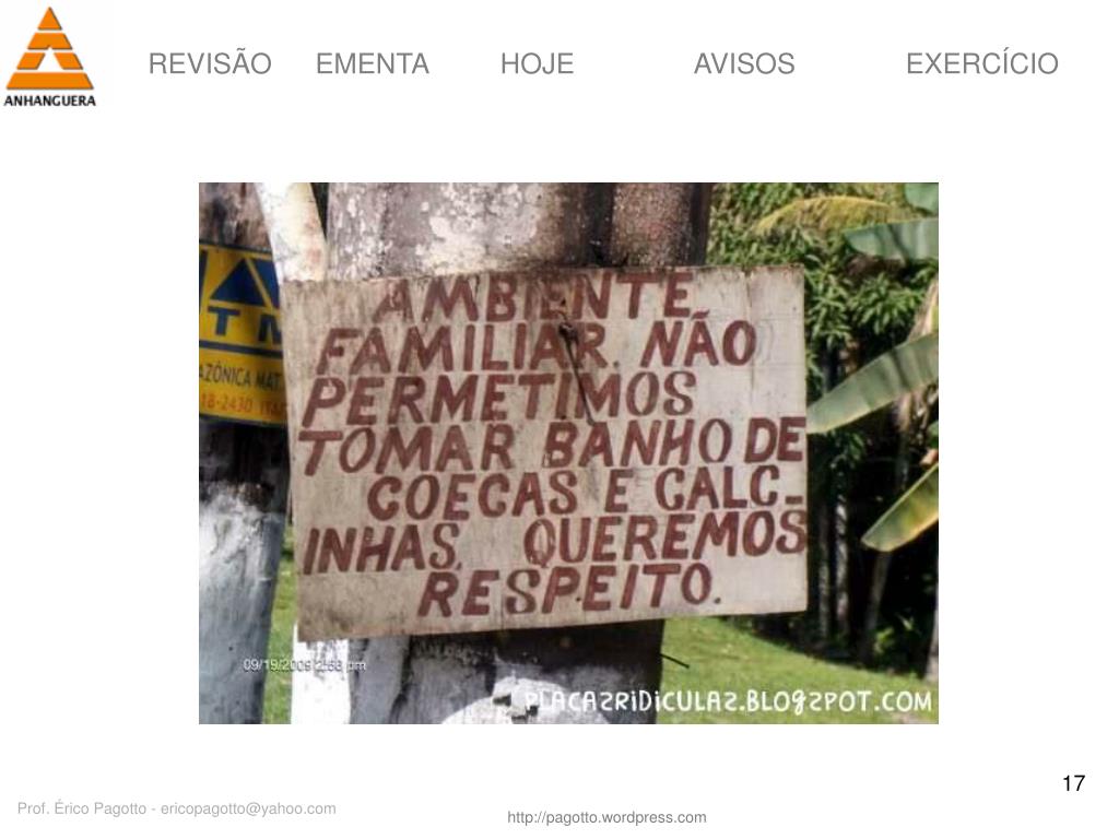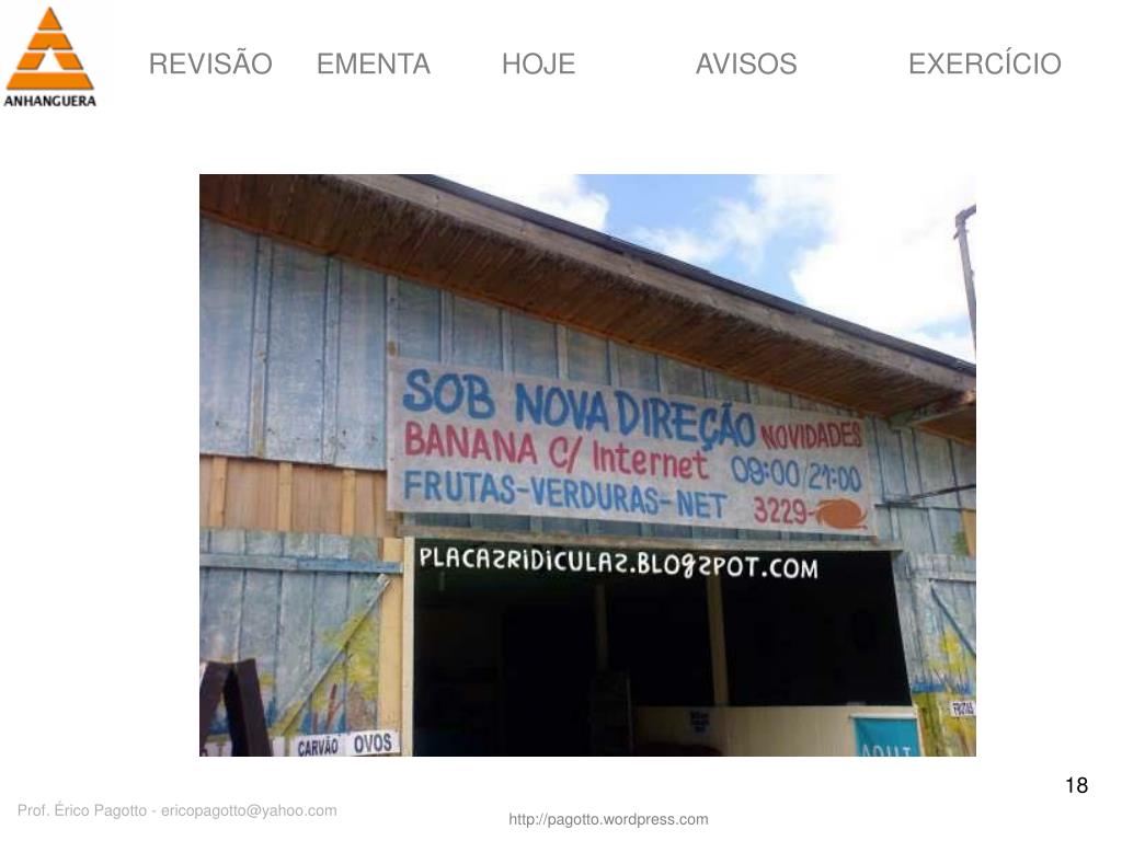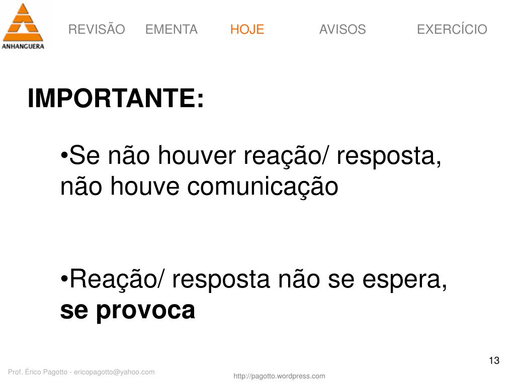 HOJE IMPORTANTE: • Se não houver reação/ resposta, não houve comunicação • Reação/ resposta não se espera, se provoca Prof. Érico Pagotto - ericopagotto@yahoo.com