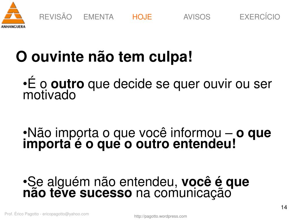 HOJE O ouvinte não tem culpa! • É o outro que decide se quer ouvir ou ser motivado • Não importa o que você informou – o que importa é o que o outro entendeu! • Se alguém não entendeu, você é que não teve sucesso na comunicação Prof. Érico Pagotto - ericopagotto@yahoo.com