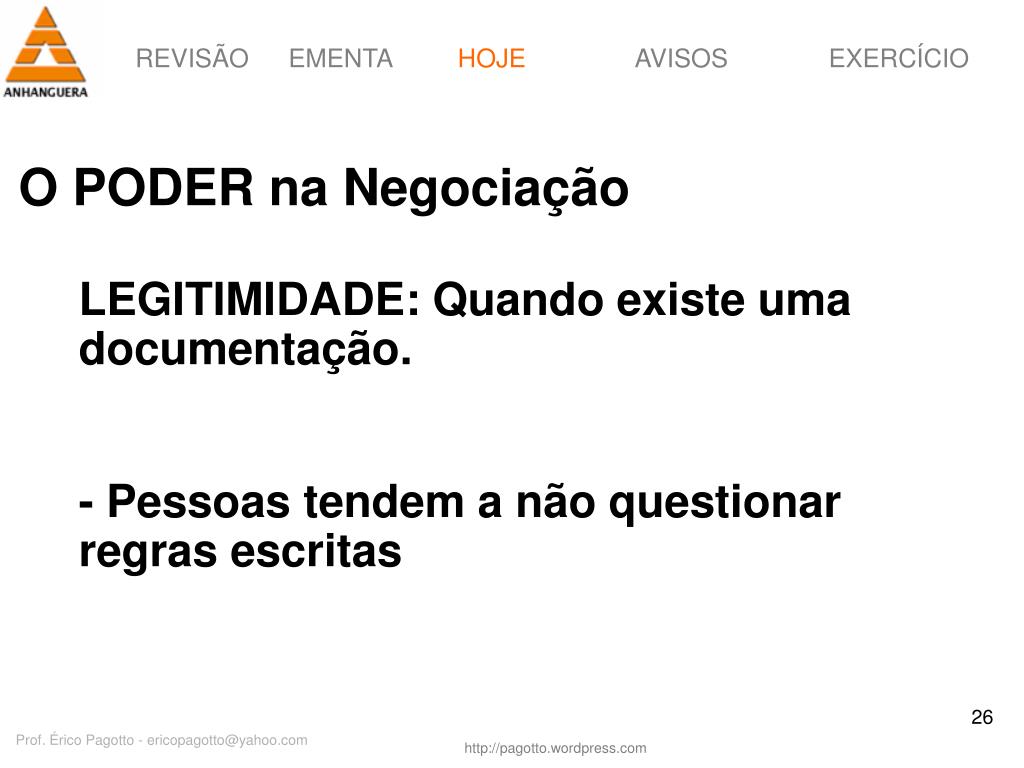 HOJE O PODER na Negociação LEGITIMIDADE: Quando existe uma documentação. - Pessoas tendem a não questionar regras escritas Prof. Érico Pagotto - ericopagotto@yahoo.com