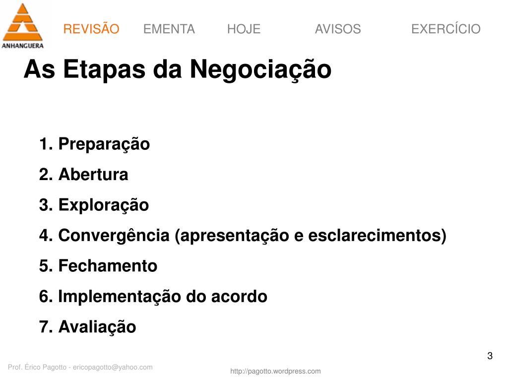 REVISÃO As Etapas da Negociação • Preparação • Abertura • Exploração • Convergência (apresentação e esclarecimentos) • Fechamento • Implementação do acordo • Avaliação Prof. Érico Pagotto - ericopagotto@yahoo.com