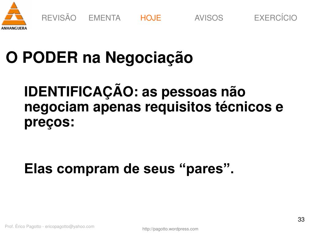 HOJE O PODER na Negociação IDENTIFICAÇÃO: as pessoas não negociam apenas requisitos técnicos e preços: Elas compram de seus “pares”. Prof. Érico Pagotto - ericopagotto@yahoo.com