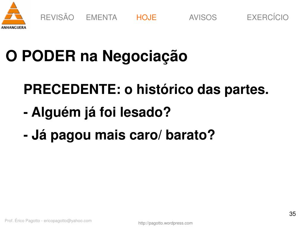 HOJE O PODER na Negociação PRECEDENTE: o histórico das partes. - Alguém já foi lesado? - Já pagou mais caro/ barato? Prof. Érico Pagotto - ericopagotto@yahoo.com