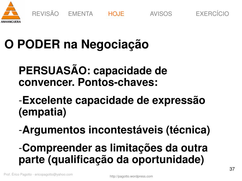 HOJE O PODER na Negociação • PERSUASÃO: capacidade de convencer. Pontos-chaves: • Excelente capacidade de expressão (empatia) • Argumentos incontestáveis (técnica) • Compreender as limitações da outra parte (qualificação da oportunidade) Prof. Érico Pagotto - ericopagotto@yahoo.com
