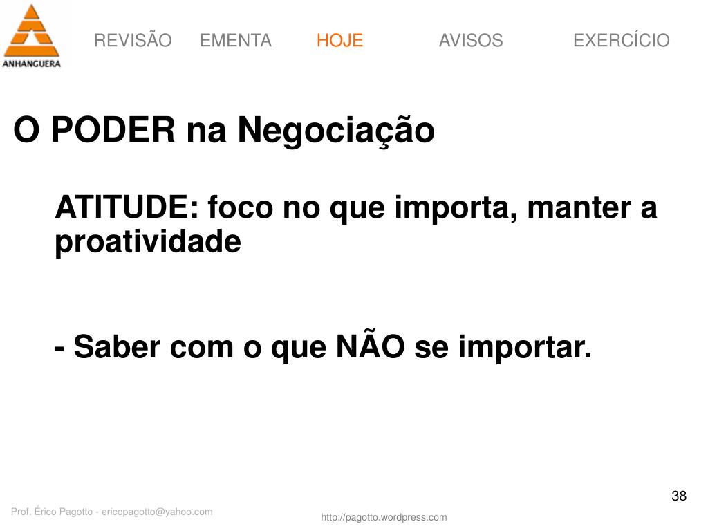 HOJE O PODER na Negociação ATITUDE: foco no que importa, manter a proatividade - Saber com o que NÃO se importar. Prof. Érico Pagotto - ericopagotto@yahoo.com