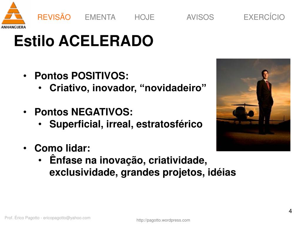 REVISÃO Estilo ACELERADO • Pontos POSITIVOS: • Criativo, inovador, “novidadeiro” • Pontos NEGATIVOS: • Superficial, irreal, estratosférico • Como lidar: • Ênfase na inovação, criatividade, exclusividade, grandes projetos, idéias Prof. Érico Pagotto - ericopagotto@yahoo.com