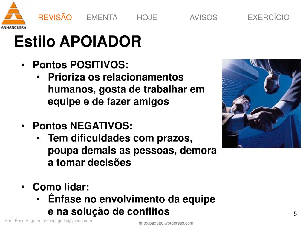 REVISÃO Estilo APOIADOR • Pontos POSITIVOS: • Prioriza os relacionamentos humanos, gosta de trabalhar em equipe e de fazer amigos • Pontos NEGATIVOS: • Tem dificuldades com prazos, poupa demais as pessoas, demora a tomar decisões • Como lidar: • Ênfase no envolvimento da equipe e na solução de conflitos Prof. Érico Pagotto - ericopagotto@yahoo.com