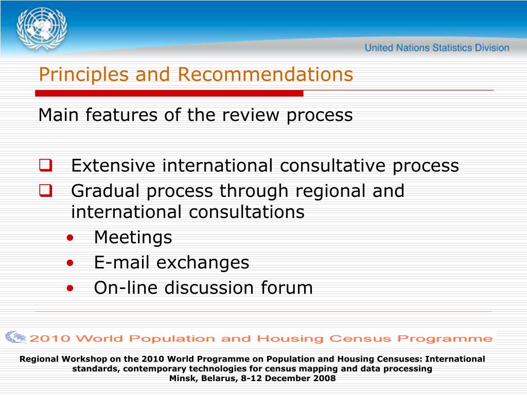 Principles and Recommendations Main features of the review process • Extensive international consultative process • Gradual process through regional and international consultations • Meetings • E-mail exchanges • On-line discussion forum Regional Workshop on the 2010 World Programme on Population and Housing Censuses: International standards, contemporary technologies for census mapping and data processing Minsk, Belarus, 8-12 December 2008